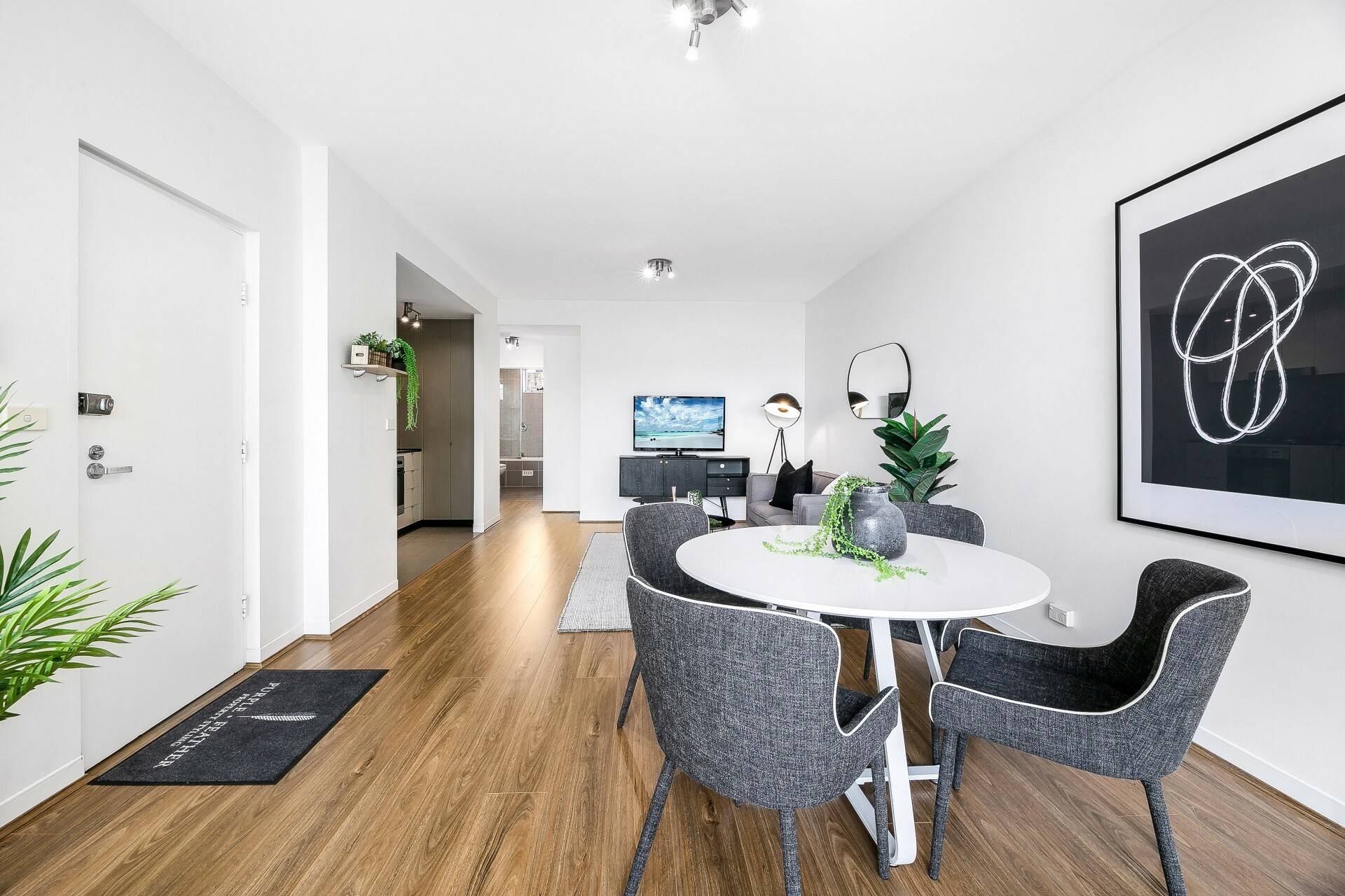 This spacious and sleek one-bedroom apartment is washed with an abundance of natural light and offers a stylish yet practical and great living experience. The airy living/dining area is enhanced by floor-to-ceiling doors, further complimented by the serene outlook from your large balcony, over the leafy internal courtyard.