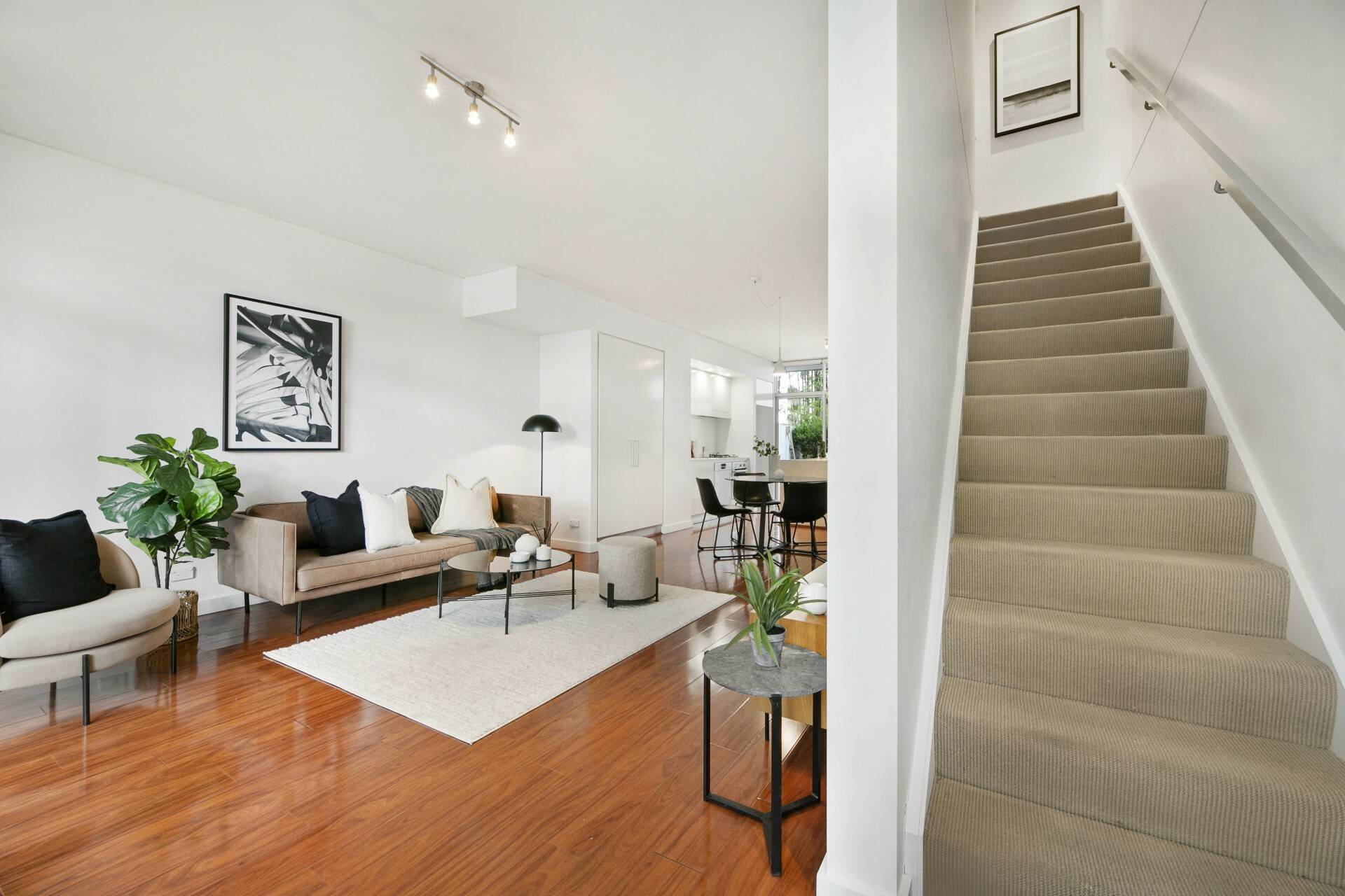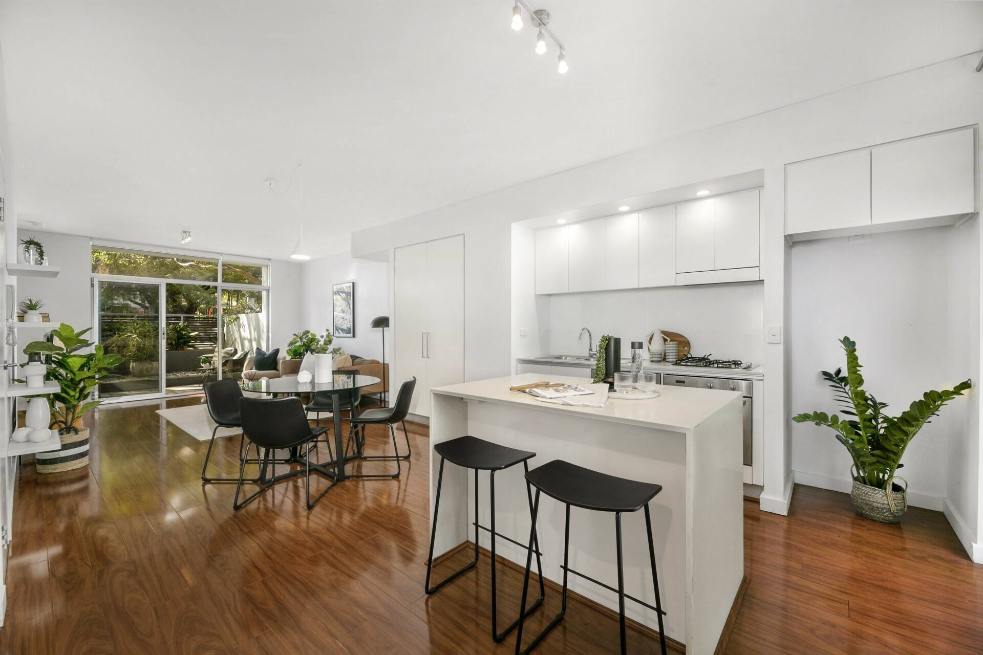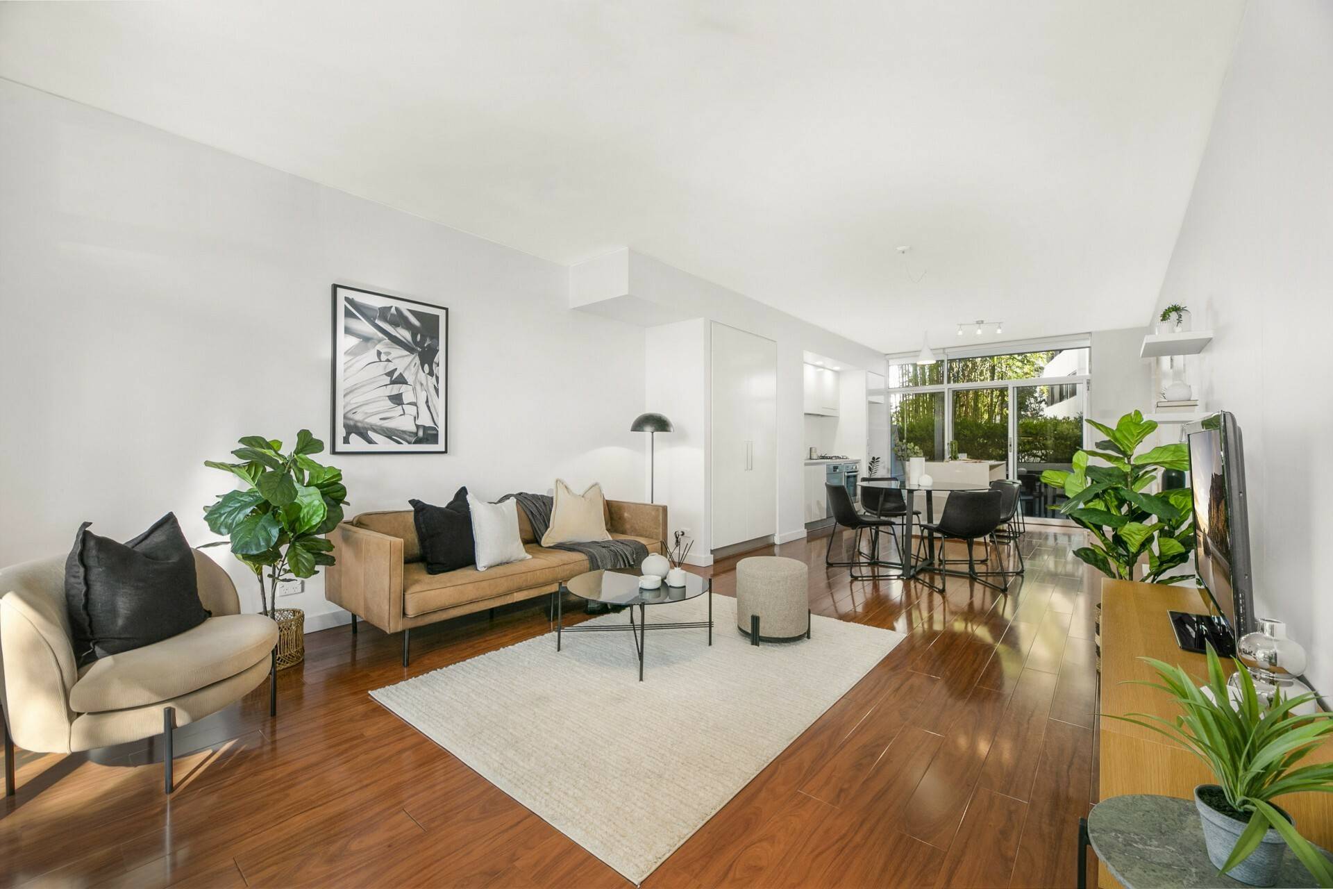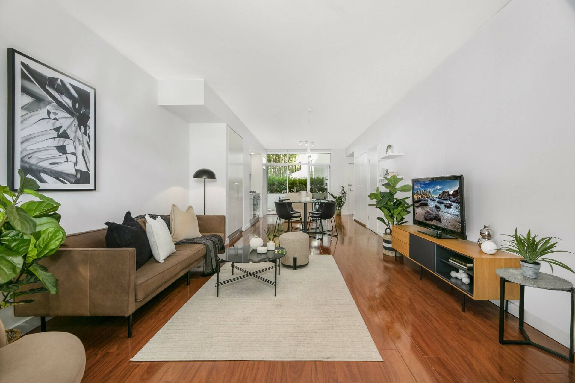 - Open plan living and dining layout on polished timber flooring